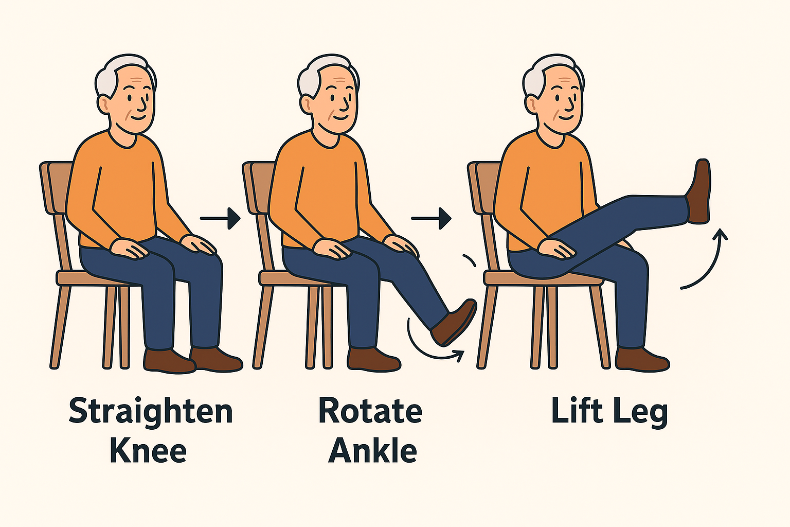 의자에 앉아서 할 수 있는 가벼운 무릎 펴기, 발목 돌리기 같은 동작으로 시작해보세요.