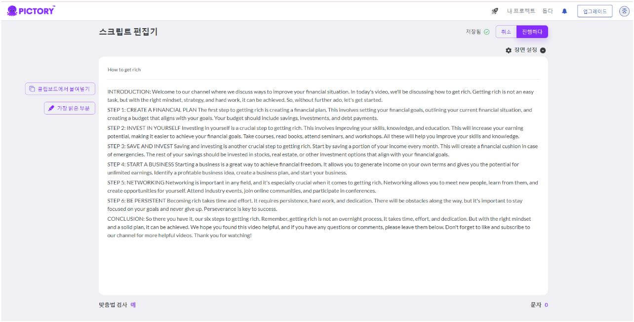 chatGPT을 활용하여 유튜브 영상을 제작할 주제를 정하고, 영상에 포함할 스크립트를 만들고 Pictory.Ai에 스크립트를 입력하고, 목소리를 선택하고, 음악을 넣어주면 자동으로 영상이 제작된다.